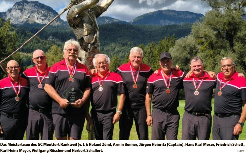 Die Ü65-Mannschaft des GC Montfort Rankweil hat bei den ÖGV-Mannschaftsmeisterschaft der Masters auf dem Platz des GC Ennstal Weißenbach in der Steiermark einen historischen Erfolg gefeiert. Mit beeindruckenden Leistungen sicherten sich die „Supersenioren“ völlig verdient den Aufstieg in die höchste Spielklasse, die 1. Division. Das Team mit Captain Jürgen Heinritz sowie Karl Heinz Meyer, Hans Karl Moser, Armin Bonner, Wolfgang Rüscher, Herbert Schallert, Roland Zünd und Friedrich Schett überzeugten auf ganzer Linie. Bereits im Auftaktspiel gegen den Erstligaabsteiger GC Murstätten gelang mit einem 3,5:1,5 Erfolg ein starkes Ausrufezeichen. Damit war das ursprüngliche Ziel-der Klassenerhalt frühzeitig erreicht. Im Halbfinale ließen die Rankweiler dem GC Eichenheim Kitzbühel keine Chance und setzten sich am Ende klar mit 4:1 durch. Im Finale wartete der traditionsreiche GC Wien, der älteste Club der Bundeshauptstadt. Auch hier behielt die Equipe aus der Oberlandgemeinde mit 3,5:1,5 die Oberhand und machte damit den Aufstieg perfekt.